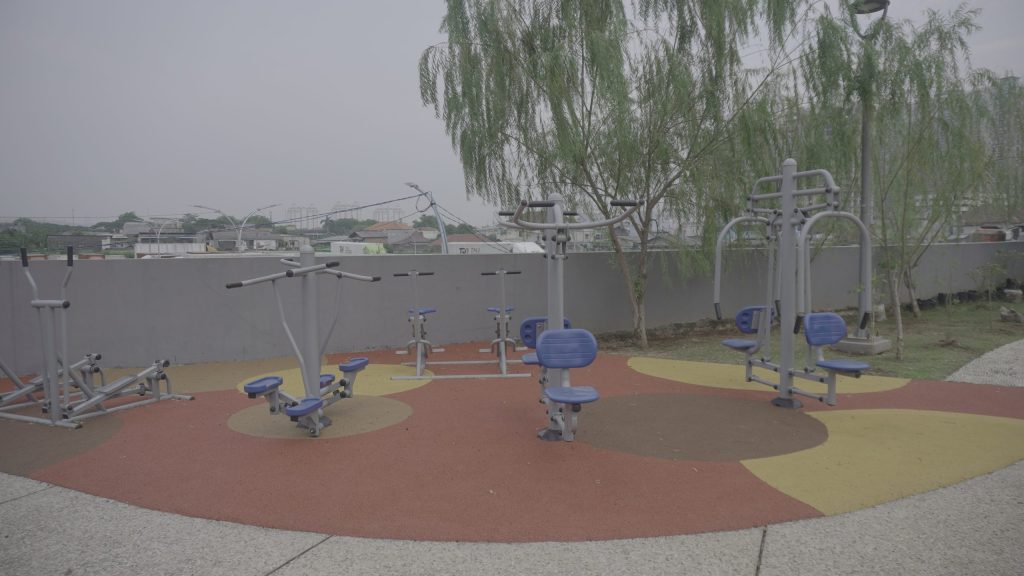 Pilihan peralatan fitness luar ruangan yang mendukung gaya hidup aktif bagi semua usia, serta rubber flooring yang aman dan nyaman.
